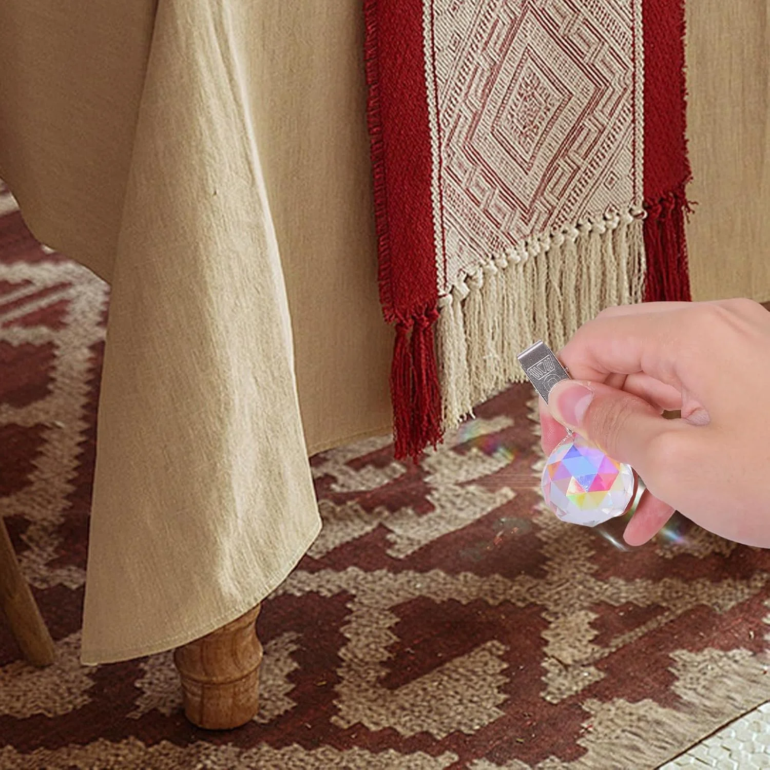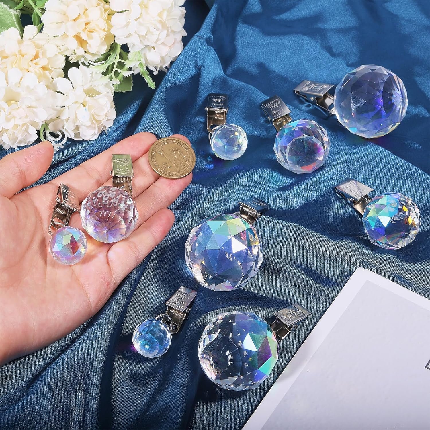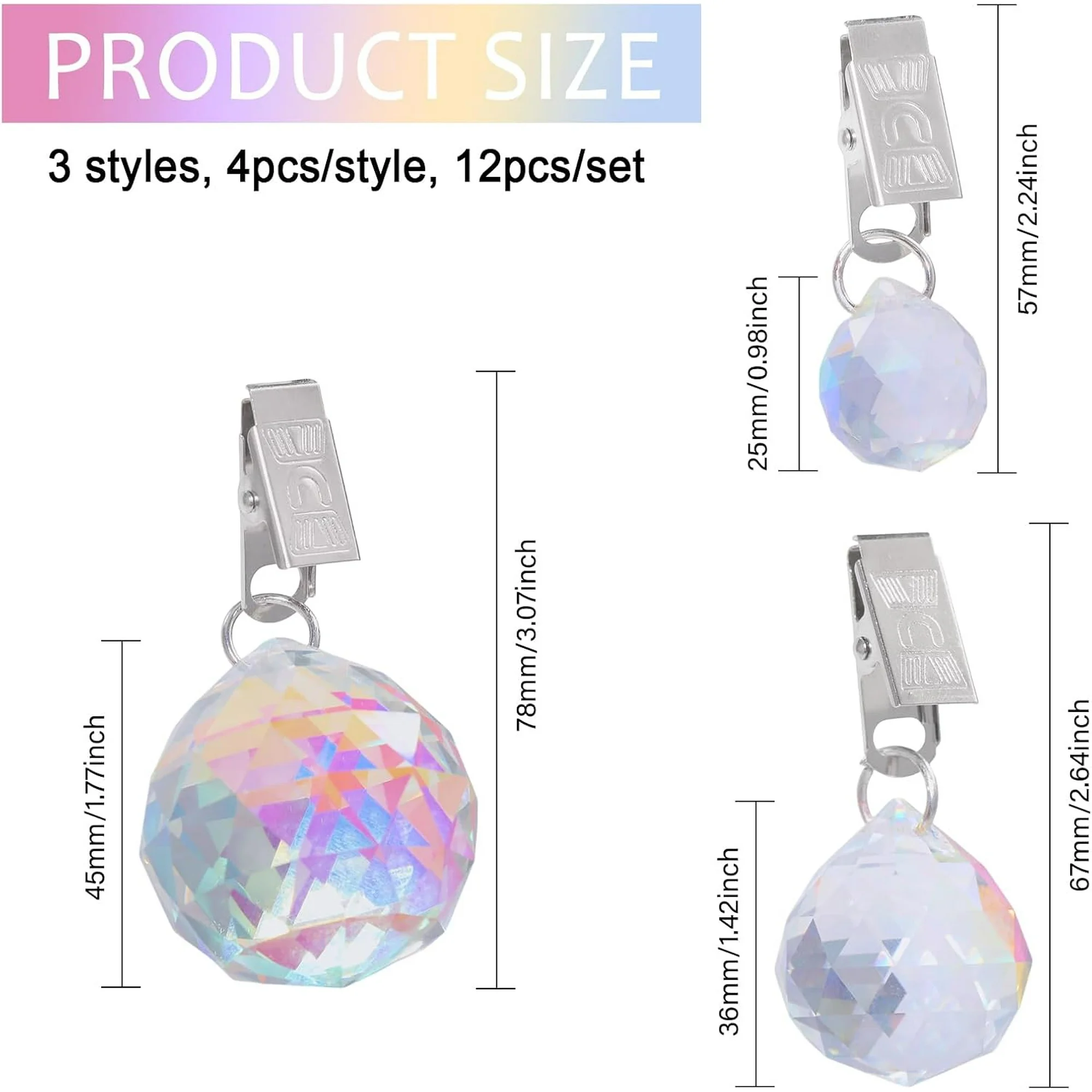 This set includes 12 colorful pendant weights in three unique styles, giving you a versatile and visually appealing solution for curtain stability. Crafted from durable high-quality glass with sturdy steel clips, these weights securely attach to fabric without causing damage. The rainbow-like reflection under sunlight adds a decorative sparkle, making them ideal for both functional and aesthetic use.