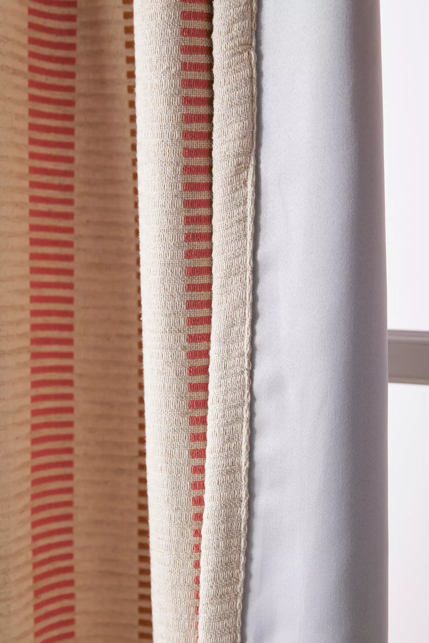 Woven patterned blackout curtains with a pieced stripe design. Blocks sunlight, enhances privacy, and adds texture and style to any room.